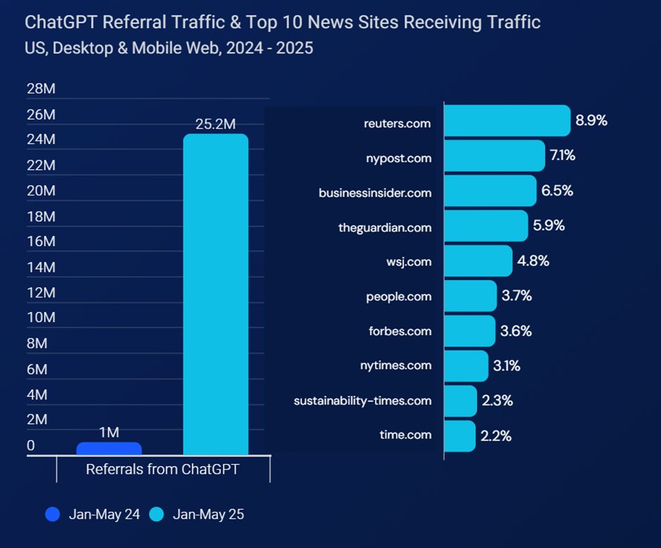 Similarweb. (2025, July). ChatGPT Referrals and AI News Consumption Trends 2024–2025. Retrieved from